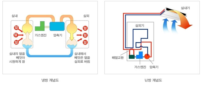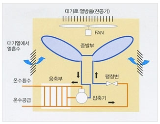 열역한 제 2법치에 의해 열은 높은 곳에서 낮은곳으로 이동하지만 이를 가역적으로 낮은 곳으로 올리도록 고안된 기계장치를 히트펌프라고 하는데, 급수 펌프가 물을 낮은 곳으로 끌어 올리는 것 처럼 열을 저온에서 고온으로 끌어 올린다하여 히트펌프라고 한다. 히트펌프는 폐쇄화로 내에서 냉매를 압축, 용축,증발 시킨다는 점에서 냉동기나 에어컨, 냉장고와 동일한 작동메카니즘을 갖니만, 이를 냉매의 증발과정에서 발생하는 냉열만을 이용하는데 다만, 이를 기기가 냉매의 증발 과정에서 발생하는 냉열만을 이용하는데 비해 히트펌프는 냉열뿐 아니라 응축과정에서의 온열도 이용한다는 점이 다르다.